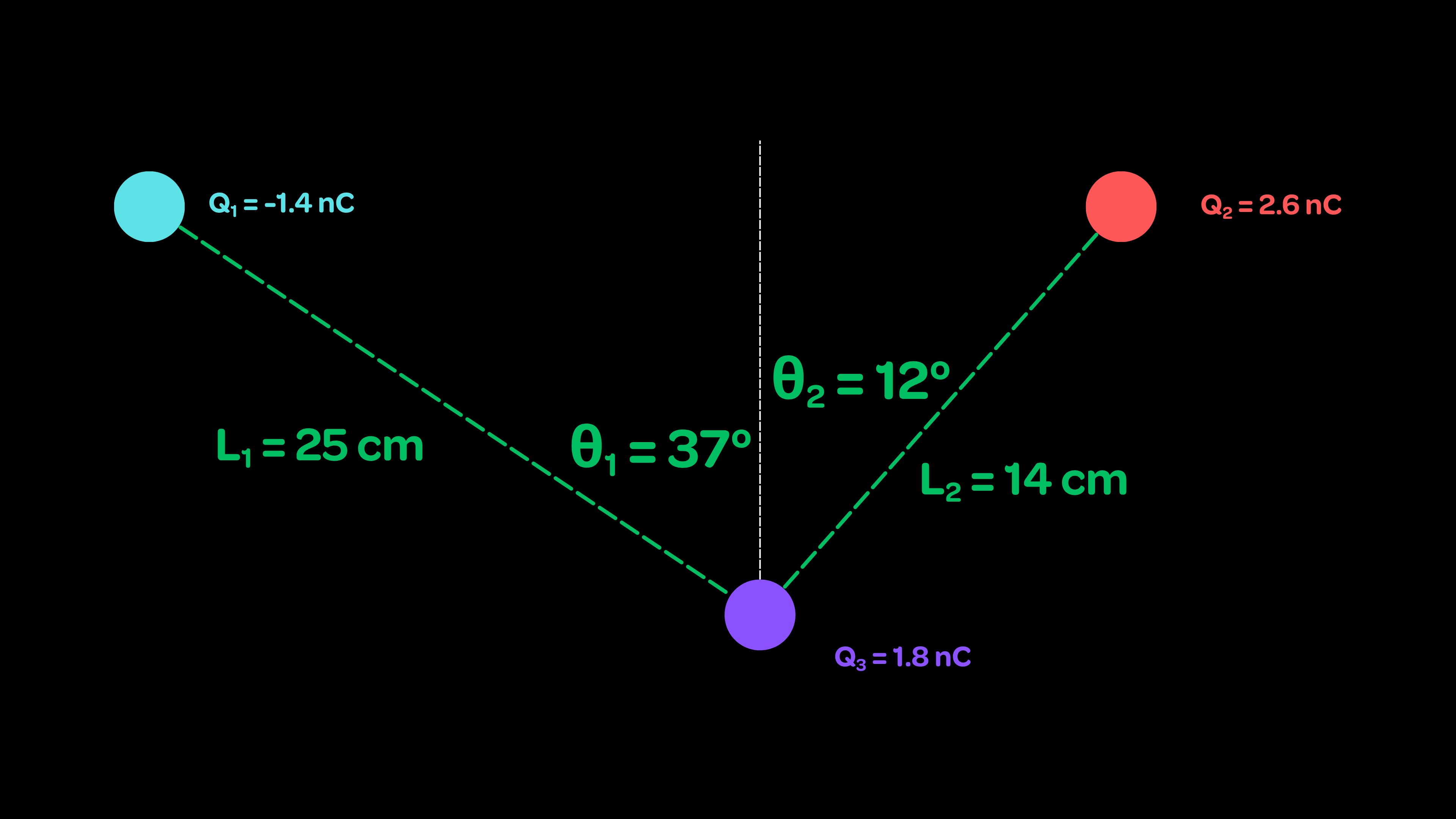 $$ F_{B} = \dfrac{1}{4\pi\epsilon_0} \dfrac{(q_1)(q_3)}{ {L_1}^2} $$ $$ F_{R} = \dfrac{1}{4\pi\epsilon_0} \dfrac{(q_2)(q_3)}{ {L_2}^2} $$ Now, we need to do some vector addition. We split each force into its x and y components, and take the vector sums of each. But before we do that, we need to consider which direction each force is in, otherwise we'll get sign errors. Our purple charge is positive, and the blue charge is negative; this means that $F_{B}$ will point toward the blue charge. Both the purple and red charges are positive, so $F_{R}$ will point away from the red charge. With this information, we can find the net force in each direction.
